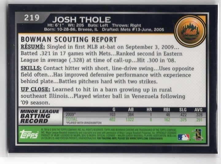 Josh Thole 2010 Topps Bowman Chrome Autograph Rookie Card #219